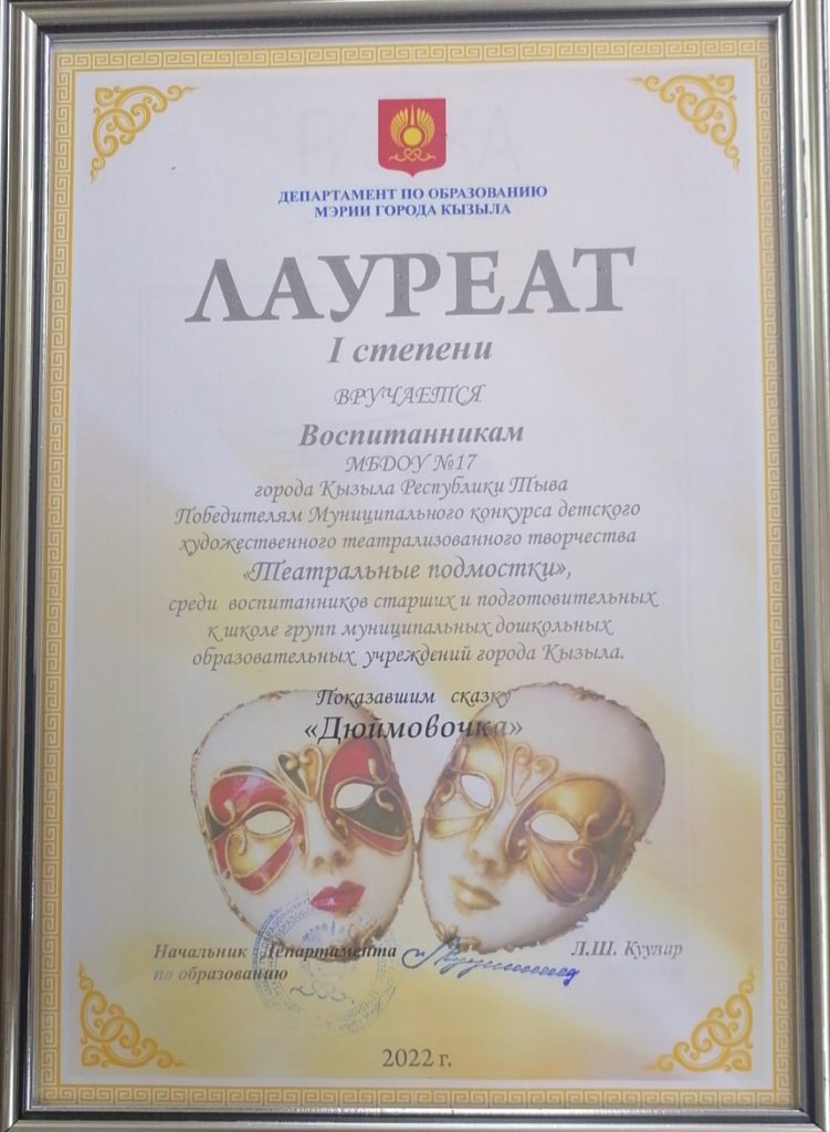 Рады сообщить , что наши воспитанники участвовали в Муниципальном конкурсе детского художественного театрализованного творчества «Театральные подмостки» среди воспитанников старших и подготовительных к школе групп муниципальных дошкольных образовательных учреждений города Кызыла стали Лауреаты I степени показавшим сказку Г.Х. Андерсена «Дюймовочка»